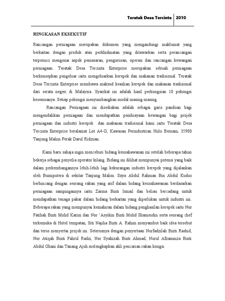 Berikut ini salah satu contoh ringkasan eksekutif bisnis plan makanan dari usaha risoles contoh laporan ringkas. Laporan hasil pengawasan semester i tahun 2012.